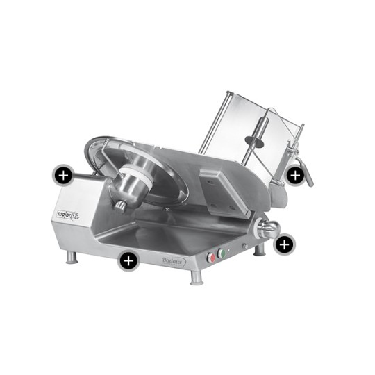 Entièrement fabriqué en Inox Aisi 304. Résiste à la corrosion. Fiabilité de fonctionnement et facilité de nettoyage grâce à un design ergonomique avec un chariot démontable. Structure très rigide. Épaisseur de la tranche réglable avec une grande précision grâce au système VARIOCUT® de 0 à 25mm. Entrainement par courroie haute performance sans tendeur. Affûteur indépendant, très simple d’utilisation. Une simple manœuvre du bouton de réglage d’épaisseur permet un affûtage parfait. Cette opération pourra être réalisée avec aisance et rapidité par tous les utilisateurs. Chariot coulissant très souple grâce à son système de guidage bien ajusté et fortement dimensionné. La robustesse et la qualité des composants associés au soin apporté au montage et ajustage permettent à cette machine de réaliser un parfait tranchage, même très fin, et une satisfaction des utilisateurs pendant de nombreuses années. Porte produit lavable en lavevaisselle. Équipé de moteurs mono de 0,27 ou 0,37 CV. Indice de protection du trancheur: IP 53. Certification UL NSF CSA