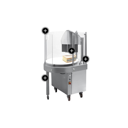 Machine conçue pour couper des fromages à pâte dure (Comté, Beaufort, Parmesan, Cantal…) . Elle permet de faire une coupe nette, parfaitement propre et très précise. Elle peut être utilisée comme vitrine de présentation ce qui limitera les multiples manipulation du produit. Sa fonctionnalité évitera les troubles musculosquelettiques aux coudes et aux épaules souvent liés à la découpe de grosses pièces avec des couteaux manuels. Machine montée sur roulettes INOX Ø100. Fonctionnement hydraulique. Chargement: Plateau tournant de 750mm, démontable et très facile à nettoyer.