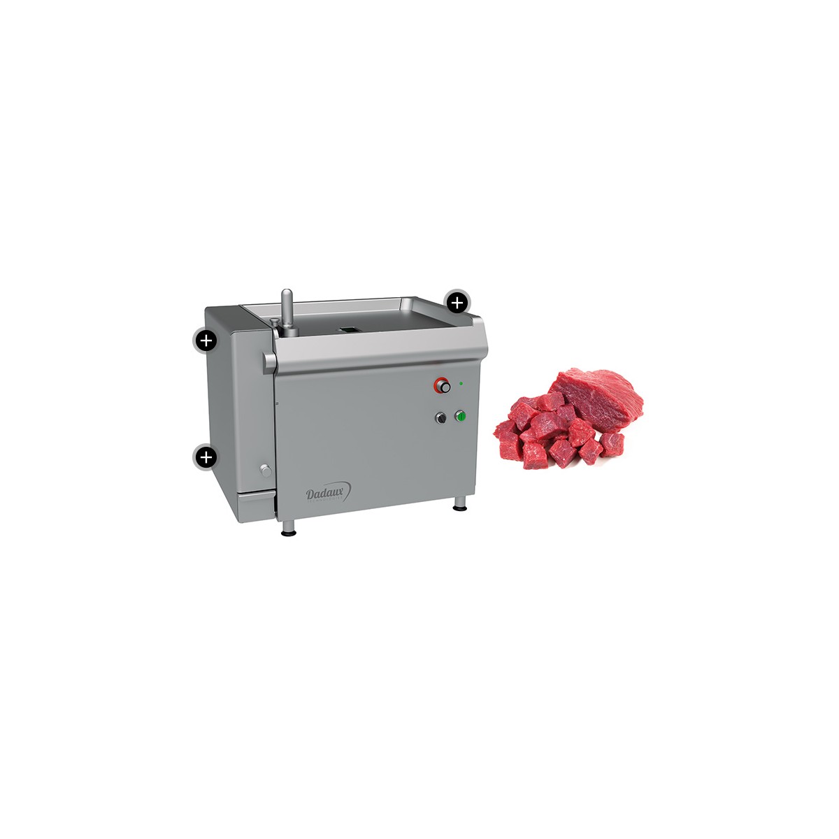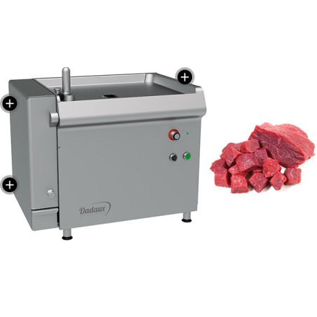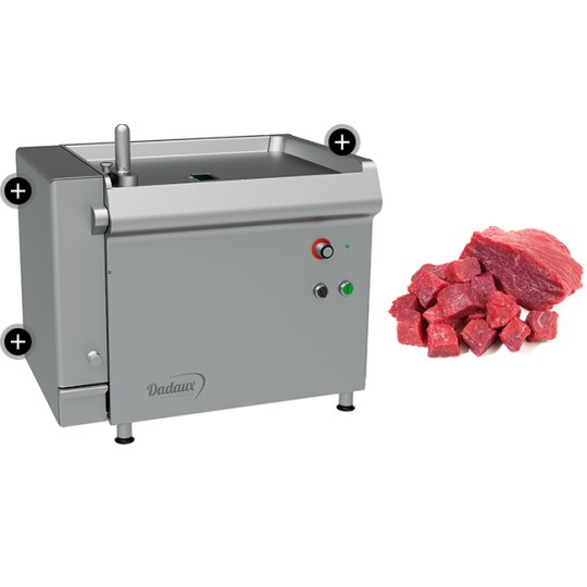 Machines de table 2d : production de cubes, émincés, lamelles, giros, shawarma, Kebab... 1d : tranchage de petites pièces de viande Entièrement iNOX 18-10 Capacité 72x72x200 mm (environ 1 kg) débit moyen 2 Kg/min livrée avec 1 outillage au choix fabrication française Conforme aux normes C.E.