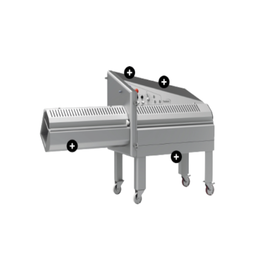 Retour automatique. Couteau lisse, semicranté, microdenté ou double. Sélection de la poussée : pas à pas ou continu en fonction des différents produits à trancher. Nettoyage de l’ensemble à grande eau. 2 cadences de coupe : 90 et 180 coups/min. Puissance raccordée 4 CV. Système d’avance hydraulique (ou electrique) : ce principe s’impose pour un usage intensif dans des conditions difficiles (humidité et froid). Conformes aux normes CE. Production Produits tranchés avec os Côtes porc, côtes veau, côtes agneau, gigots, poitrines, etc. Produits tranchés sans os Faux filets, entrecôtes, ronds de gîtes, pierrade, carpaccio. Charcuterie Poisson en darne