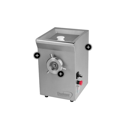 Entièrement inox 1810: carter corps hélice écrou, etc. Carter monobloc. Démontage du corps par simple déverrouillage de la poignée latérale (TX82 seul). Réducteur à bain de graisse (graissé à vie). Pignons en acier trempé et rectifiés. Alimentation triphasée 220/380 V 50/60 HZ. Option monophasée 220 V