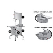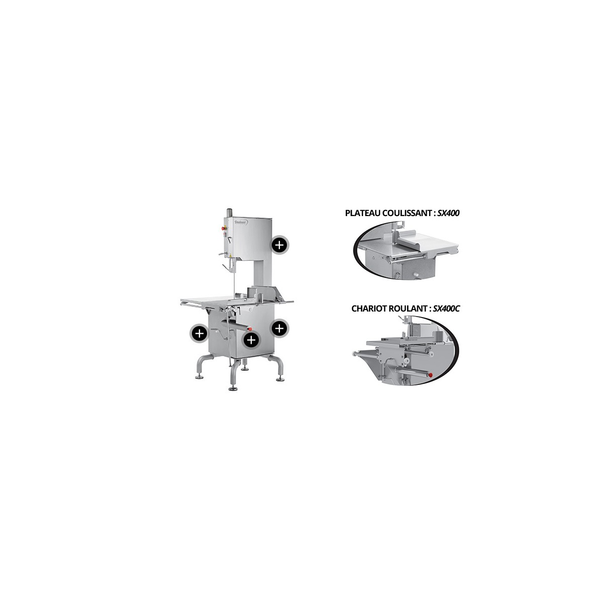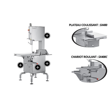 Entièrement Inox. Bâti forte épaisseur parfaitement rigide. Tendeur automatique de lame. Guide lame supérieur coulissant avec maintien en position automatique. Chariot coulissant pour la scie SX400. Très facile à entretenir. Moteur et matériel électrique protégés contre les projections d’eau. Conformes aux normes CE. Certifiée Adive.