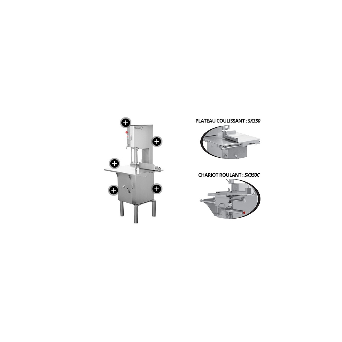 Entièrement Inox. Bâti forte épaisseur parfaitement rigide. Tendeur automatique de lame. Guide lame supérieur coulissant avec maintien en position automatique. Très facile à entretenir. Chariot coulissant pour les scies SX350C pour une accessibilité parfaite pour le nettoyage. Moteur et matériel électrique protégés contre les projections d’eau. Conformes aux normes CE. Certifiée Adive.